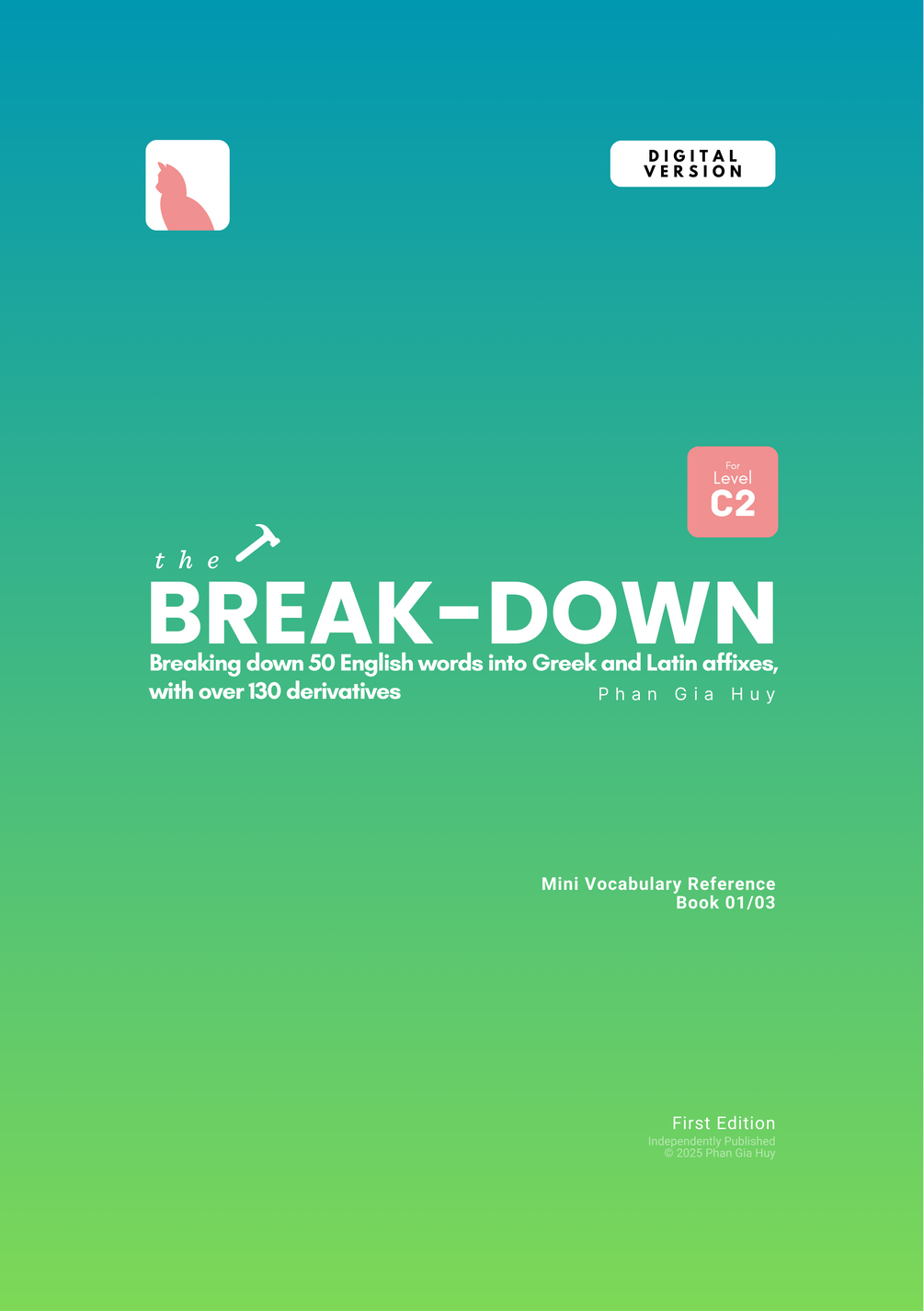 A compact C2 vocabulary book that breaks 50 English words into Greek and Latin parts to make meanings and word families easier to grasp.